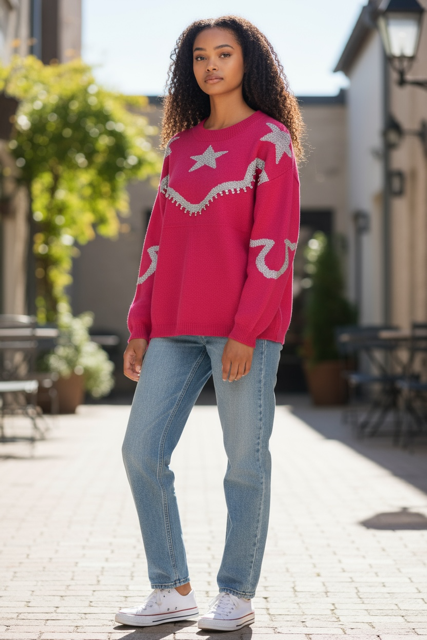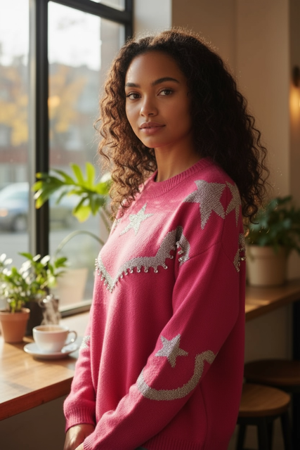 Wrap yourself in celestial charm with this playful hot pink stars sweater. Featuring an eye-catching design of scattered stars across a cozy knit, it's the perfect piece to add a whimsical touch to your everyday wardrobe. Whether you're channeling cosmic vibes or just want to shine bright, this sweater brings fun and personality to any outfit. Soft, comfortable, and undeniably cute—your new favorite layer awaits.