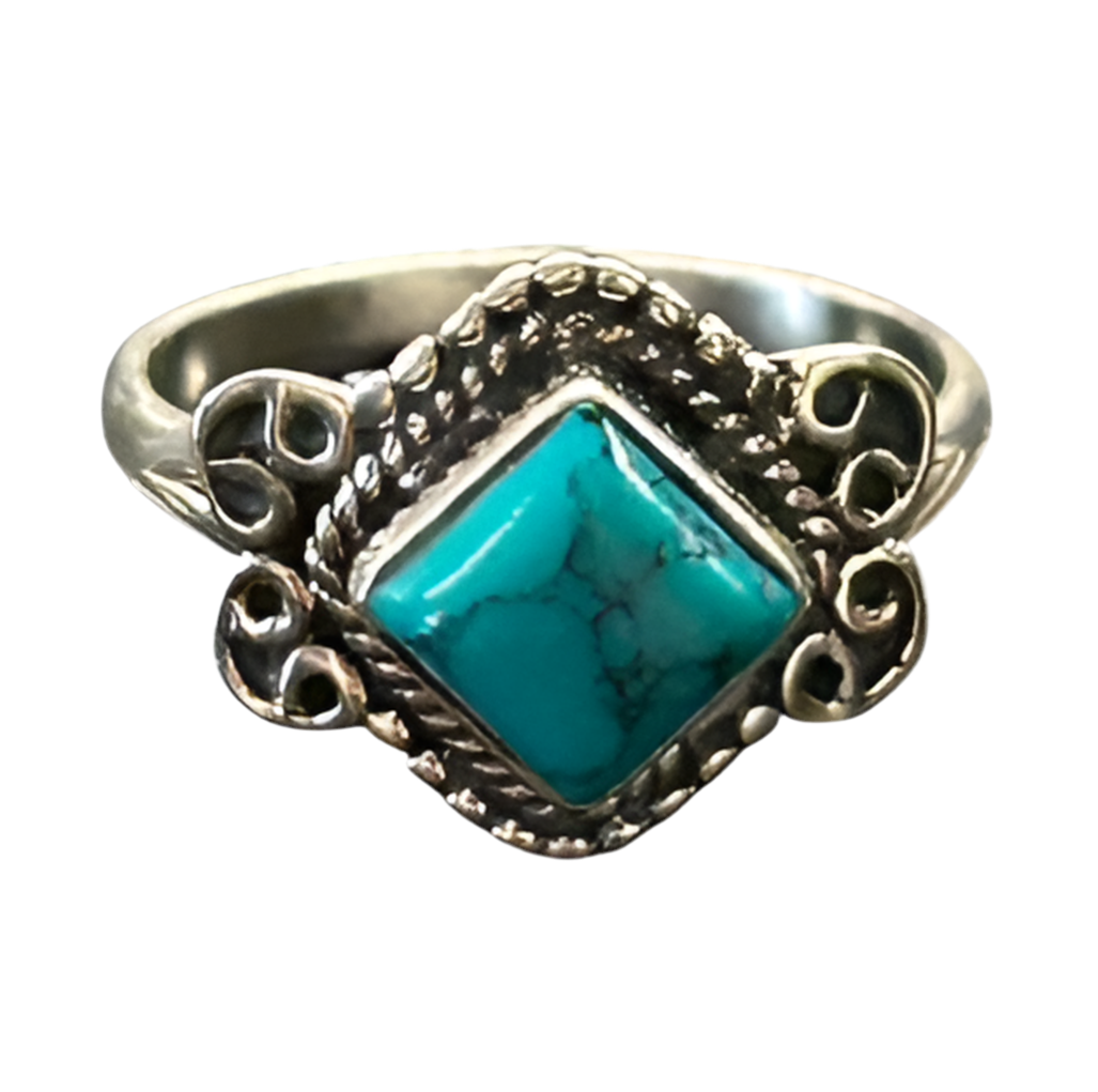 This classic size 6 ring called the Delta Dawn ring features a sterling silver band with a bold diamond-shaped turquoise stone. Its striking design exudes confidence, making it the perfect accessory for those who want to showcase their fearless style.