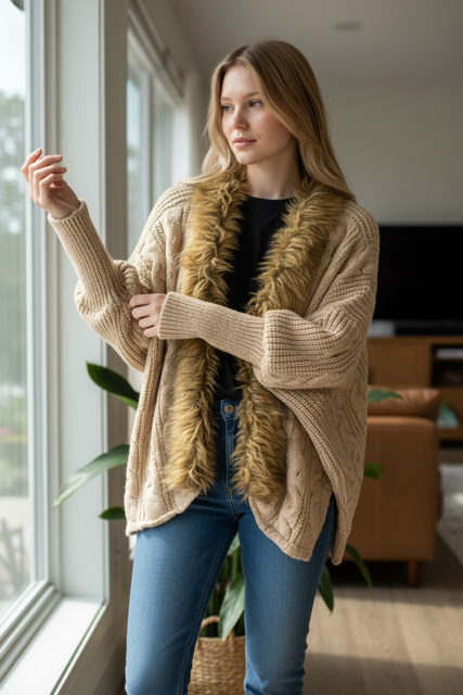Roar into any room in this soft tan cardigan that means business—and comfort. The plush fur collar adds a touch of wild glamour, perfect for layering over your favorite tee or dress. Whether you're conquering the day or cozying up for the evening, this piece is your go-to for effortless style with serious attitude. Channel your inner tiger and own every moment.
