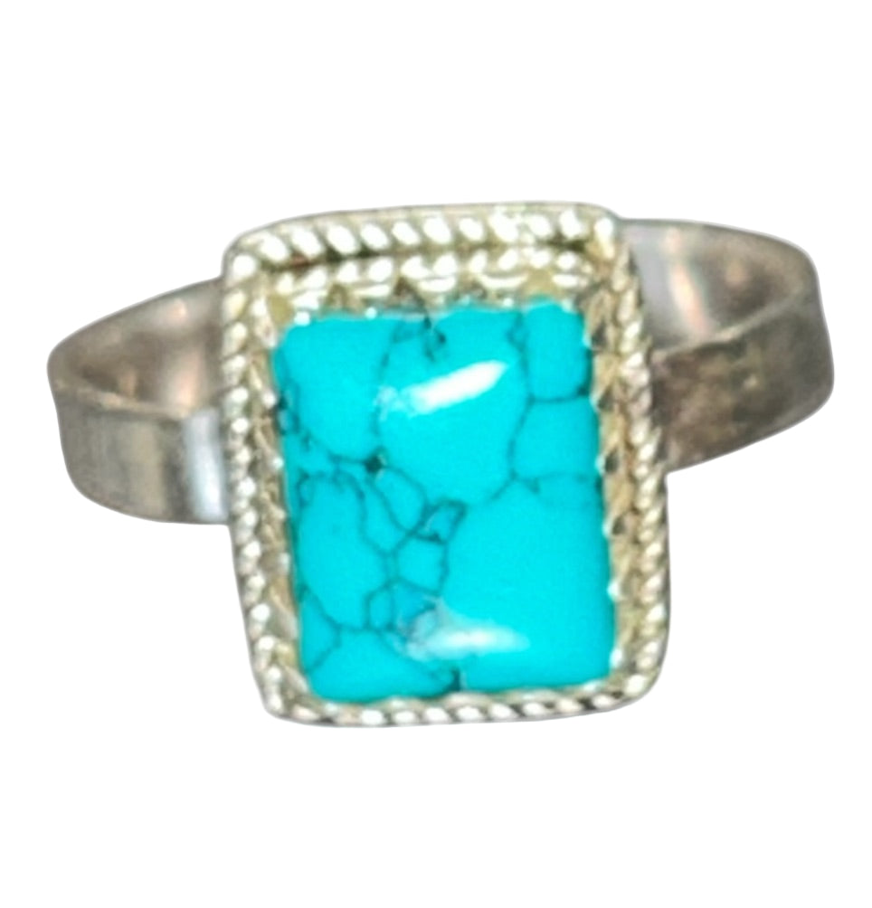 The Lainey ring features a sterling silver band paired with a striking square turquoise stone, size 8.5. Its clean, elegant design offers a timeless accessory that adds a vibrant pop of color to any outfit, making it perfect for daily wear or special occasions. Crafted for both style and comfort, this ring is an ideal choice to elevate your jewelry collection.
