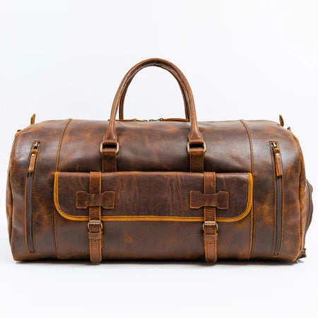 Take your travels to the next level with this Weekender Leather Duffle. Made from high-quality full-grain leather, this 23-inch duffle boasts a variety of compartments for all your travel essentials, including shoes, clothes, toiletries, and more. Perfect for trips lasting 4-7 days, this duffle is a beautiful and functional addition to your luggage collection.