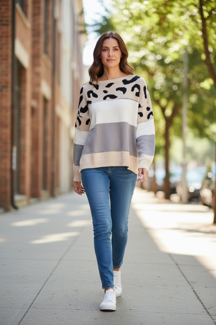 Prissy is your go-to layering piece for effortless style. This cheetah-print sweater features a flattering silhouette perfect for mixing and matching with your favorite basics. The soft fabric keeps you cozy while the bold pattern adds instant personality to any outfit. Dress it up or down—this versatile sweater works as hard as you do. Whether you're layering over a crisp white tee or pairing it with your favorite jeans, Prissy brings that playful edge to your wardrobe.