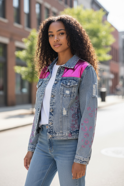 - This denim jacket features pink accents that add a pop of color. šø