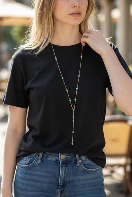 Catch the glow of golden hour with this stunning gold chain featuring a gorgeous turquoise oval centerpiece. The rich warmth of the gold pairs beautifully with the cool, calming vibes of the turquoise stone, creating a look that's equal parts sophisticated and fun. Whether you're dressing up your everyday style or adding a pop of color to a special occasion outfit, this piece brings that perfect sunset-inspired charm. Layer it, wear it solo, or let it be the star of your jewelry collection—either way, you're in for a good time.