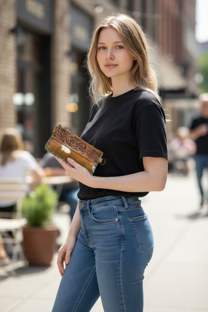 Meet the Wild Willow—where rugged craftsmanship meets boho charm. This hand-tooled leather wallet transforms into a crossbody bag, featuring supple leather adorned with hand-tied turquoise accents that catch the light beautifully. Perfect for the adventurer who refuses to choose between style and function, it's a statement piece that tells a story with every wear. Durable, distinctive, and undeniably cool.